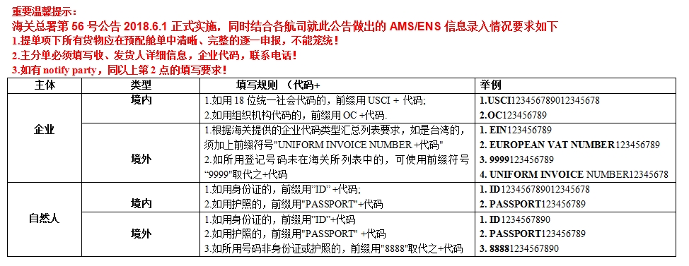 為進(jìn)一步規范化進(jìn)出境運輸工具及艙單數據申報,夯實(shí)海關(guān)監管業(yè)務(wù)基礎,海關(guān)總署于2017年56號公告將于2018年6月1日起施行,對于進(jìn)口至中國大陸卸船的貨物或經(jīng)中國大陸港口中轉的貨物,從2018年6月1日起,裝港(指貨物進(jìn)境中國前的最后一個(gè)海外港口)需在貨物裝船前24小時(shí)前向中國海關(guān)發(fā)送貨物完整、準確的艙單數據。